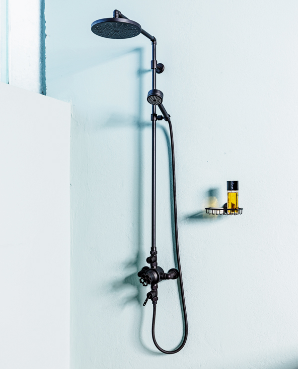 Dabei umfasst sie eine Vielzahl von rudimentär wirkenden Einzelprodukten für das komplette Bad: von Badewanne und Dusche über verschiedenes Zubehör bis hin zu Armaturen und Waschtischen. Die massive Aufputz-Thermostat-Duscharmatur, die Thermoelement, Hand- sowie Kopfbrause vereint, setzt ein echtes Ausrufezeichen. Zum Waschtisch gehört derweil ein auf die stilvolle Armaturenserie abgestimmtes Untergestell, zudem eine Holzträgerplatte für ein metallenes, ebenfalls der Armaturenfarbe angepasstes Metallwaschbecken.
