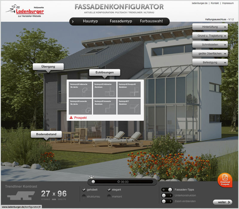 Das Fassadendesign bestimmt die optische Wirkung eines Gebäudes – mit ihrer Gestaltung legen sich Planer und Hausbesitzer auf Jahrzehnte hin fest. Eine bestechend einfache Möglichkeit zur Simulierung der Wirkung unterschiedlicher Farbgebungen und Verlegearten bei Holzfassaden bietet der kostenlos nutzbare Online-Fassadenkonfigurator auf www.ladenburger.de. Sieben Haus- und drei Fassadentypen sowie neun verschiedene Farbstellungen gestatten es Architekten, Planern und Hausbesitzern mit nur wenigen Mausklicks für nahezu alle wichtigen Haustypen völlig unterschiedliche Gestaltungsvarianten durchzuspielen.