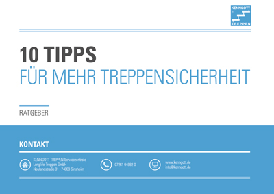 Das Treppensteigen wird bereits als Kind erlernt und in jahrzehntelanger Praxis verinnerlicht. Weichen plötzlich Parameter wie z.B. das Steigungsverhältnis von der gelernten Erwartung ab, erhöht sich die Unfallgefahr. Im Umkehrschluss lässt sich die Treppennutzung durch Beachtung bestimmter Vorgaben wesentlich sicherer gestalten. Worauf es dabei ankommt, hat Kenngott-Treppen in seiner kleinen Fibel „10 Tipps für mehr Treppensicherheit“ zusammengetragen. Das E-Book kann kostenlos heruntergeladen, weitergereicht und beispielsweise in Beratungsgesprächen eingesetzt werden.