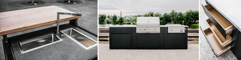 Standardfarben der Korpusse sind Anthrazit, Schwarz, Weiß sowie Cortenstahl. Den Vorteil der Fertigung in Eigenregie sieht das Unternehmen vor allem in seiner Unabhängigkeit von den Zwängen vorhandener Fertigungsprozesse, Materialien und Maschinen. Statt existente Küchensysteme notgedrungen irgendwie wetterfest auszustatten, denkt das Grillzimmer-Team lieber gleich von Grund auf komplett neu.