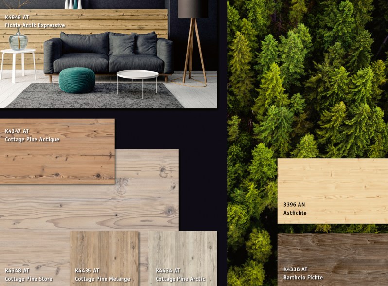 Der Tannenbaum steht bei uns alle Jahre wieder im Rampenlicht – spätestens zur Weihnachtszeit ist er als „Objekt der Begierde“ fixer Bestandteil vieler traditioneller Familienfeiern. Das allseits beliebte Nadelholz findet aber auch in der Innenraumgestaltung mit ganz unterschiedlichen Erscheinungsbildern großen Zuspruch. Kaindl bietet in seinem Dekorplattensortiment gleich sieben ausdrucksstarke Nadelholz-Dekore an – reichlich Auswahl für alle Bedürfnisse im Kreieren von Interieurs. Die Einsatzmöglichkeiten für kreative innenarchitektonische Ideen decken dabei ein breites Spektrum von endlos bis zeitlos ab. Die ausgewählten Optiken stammen sämtlich aus der Familie der Kieferngewächse und wurden vom firmeneigenen Dekorentwicklungsteam auf ihre spezifischen Charakteristiken hin verfeinert.