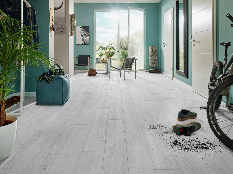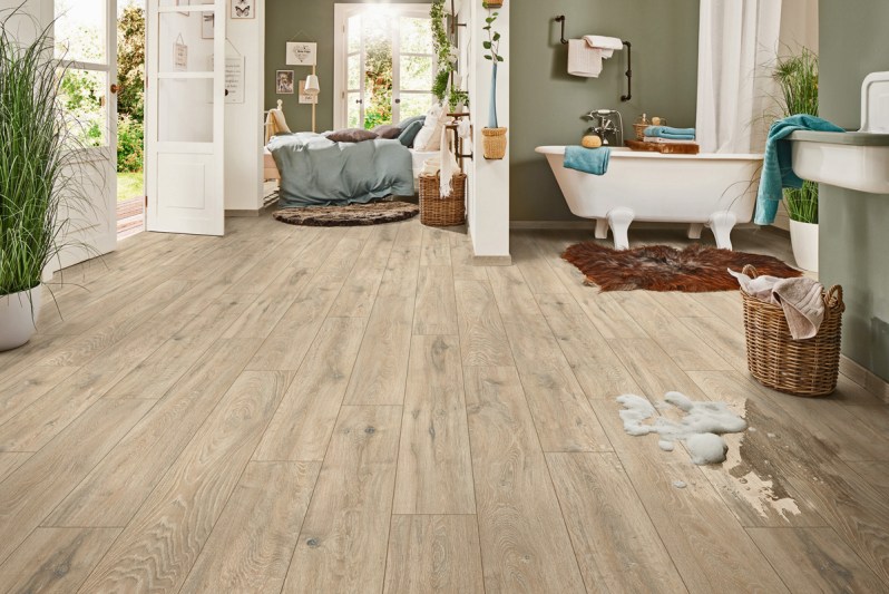 Ob Teppich, Parkett, Fliesen oder Laminat – Fußböden sind jeden Tag teils erheblichen Belastungen ausgesetzt. Neben beispielsweise spielenden Kindern, Haustieren oder dem Verrücken von Möbeln wird insbesondere Nässe regelmäßig zur Herausforderung. Das gilt nicht nur für überschwappendes Badewasser, Spritzwasser aus der Dusche oder Wassertropfen rund um den Spülenbereich in den klassischen Feuchträumen Bad und Küche. Feuchtigkeit kann im gesamten Wohnbereich zum Problem werden: Beispielsweise können nasses Schuhwerk, Gießwasserrückstände oder versehentlich verschüttete Getränke dem Boden Schaden zufügen – sowohl in Bezug auf Optik als auch auf Langlebigkeit und Funktionalität. Der Laminatbodenspezialist Logoclic hat mit seiner Produktserie Aquaprotect einen überaus attraktiven Bodenbelag im Programm, der dank seiner besonderen Ausstattung ganz hervorragend gegen Feuchtigkeit gewappnet ist.