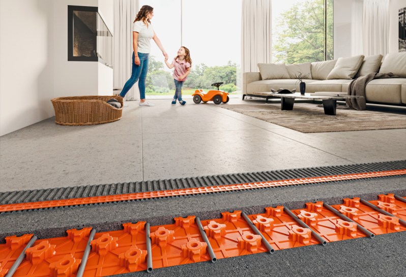 Schlüter-BEKOTEC-THERM eignet sich ganz hervorragend für den Einsatz mit regenerativen Energiequellen. Betrieben beispielsweise mit einer Wärmepumpe arbeitet sie unabhängig von Öl oder Gas, was bei den aktuellen Aussichten einen großen ökonomischen und ökologischen Vorteil darstellt. Weitere Pluspunkte: Dank der geringen Estrichüberdeckung wird bereits beim Einbau eine erhebliche Menge des knappen Rohstoffs Sand eingespart. Die dünne Belegschicht verkürzt nicht nur die üblicherweise lange Wartezeit bis zur Estrichtrocknung. Auch das anschließende, aufwändige Belegreifheizen können Architekten und Planer streichen, wodurch mit einer Bauphasenverkürzung von mehreren Wochen gegenüber herkömmlichen Fußbodenheizungen kalkuliert werden kann.