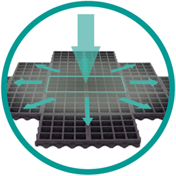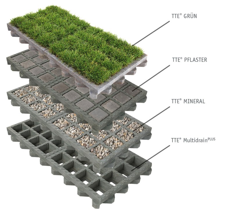 Im Mittelpunkt des TTE® Baukonzeptes steht das Rasengitter TTE® MultidrainPLUS. Es kann wahlweise mit Pflastersteinen oder mineralischen Füllstoffen befüllt oder begrünt werden. Dank seiner hohen Versickerungsleistung werden selbst Starkniederschläge vollständig aufgenommen, zusätzliche Entwässerungsmaßnahmen sind meist nicht notwendig. Die Rasengitter sind miteinander verzahnt – Lasten werden entsprechend dem Schneeschuhprinzip verteilt, Schub- und Scherkräfte aufgefangen. Trotz im Schnitt bis zu 50 Prozent geringerer Tragschicht-Aufbaustärke ist TTE® für Schwerlastverkehr zugelassen (Belastungsklasse SLW 60).