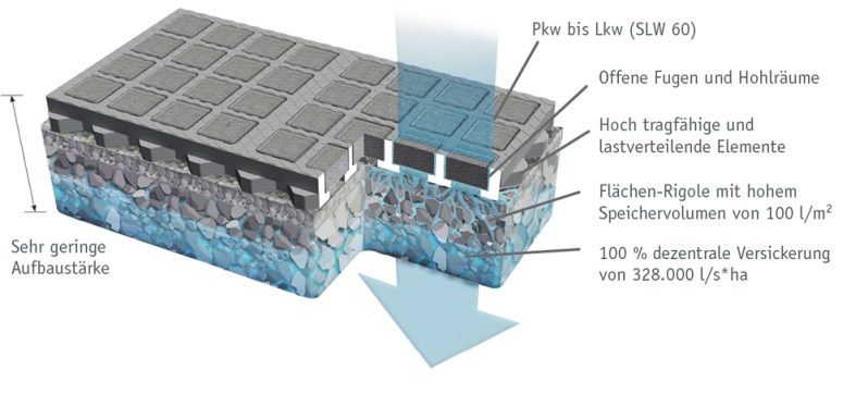 „TTE®“ steht für Trennen, Tragen, Entwässern – das innovative System vereint Tragschicht, Belag und Versickerungsanlage und schafft so blau-grüne Infrastrukturen im urbanen Umfeld.