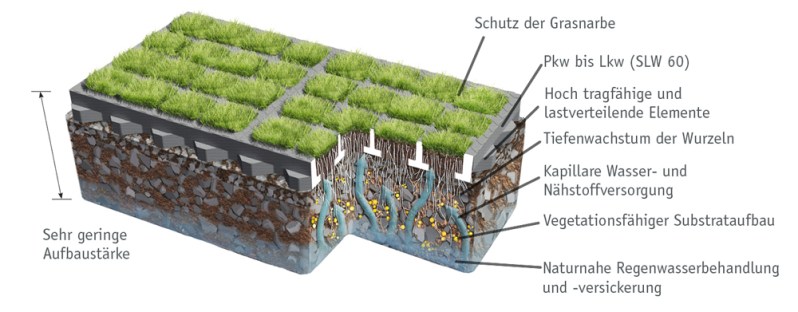Die Bauweise TTE® GRÜN eignet sich ideal zur Schaffung naturnaher Vegetationsbedingungen. Ihr bis zu 35 cm hoher Substrataufbau kann Wasser wie ein Schwamm aufnehmen – so ist eine optimale Nährstoffversorgung für das Wurzelwerk sichergestellt. Wurzeln können sich auch unterhalb des Belags ausbreiten, wodurch eine dauerhaft vitale und belastbare Begrünung entsteht. Der Belag überzeugt optisch und unterstützt eine naturnahe Regenwasserbehandlung. Gleichzeitig wird der Untergrund vor schwermetallhaltigem Reifenabrieb und Mineralölen geschützt und Schadstoffe von Milliarden Mikroorganismen in den Substratschichten abgebaut. Auch Feinstaub und CO2 werden absorbiert, was die Luftqualität positiv beeinflusst.
