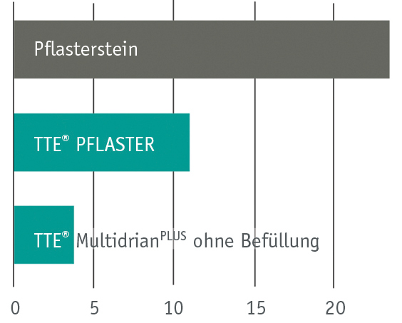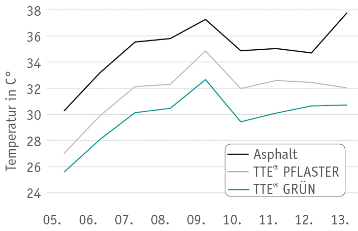 Die gespeicherten Niederschläge verdunsten bei steigenden Temperaturen und kühlen dadurch die Umgebung ab. Folglich verhindert TTE® GRÜN bei langanhaltender Trockenheit die Entstehung urbaner Hitzeinseln. Eine wissenschaftliche Studie belegt diesen positiven Einfluss auf das städtische Klima: Der durchschnittliche Temperaturunterschied im Vergleich zu einer asphaltierten Fläche beträgt – 5 °C und für TTE® MULCH (eine mit Holzhackschnitzeln befüllte Sonderlösung) sogar – 6 °C.